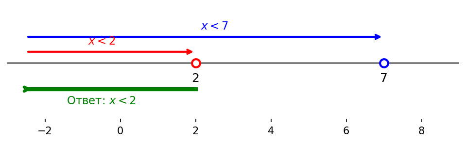 Условие: а) $\begin{cases} x < 7, \\ x < 2; \end{cases}$ б) $\begin{cases} x < -1, \\ x < 3; \end{cases}$ в) $\begin{cases} x < -5, \\ x < 0; \end{cases}$ г) $\begin{cases} x < -10, \\ x < -16. \end{cases}$