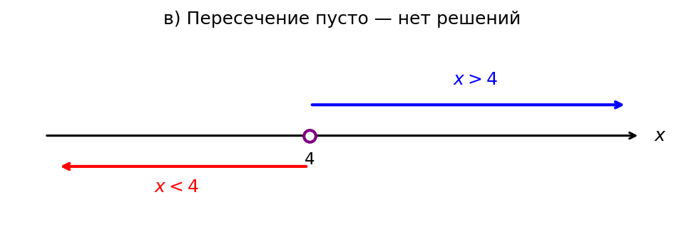 Решениями системы могут быть только те , которые одновременно больше 4 и меньше 4. Таких