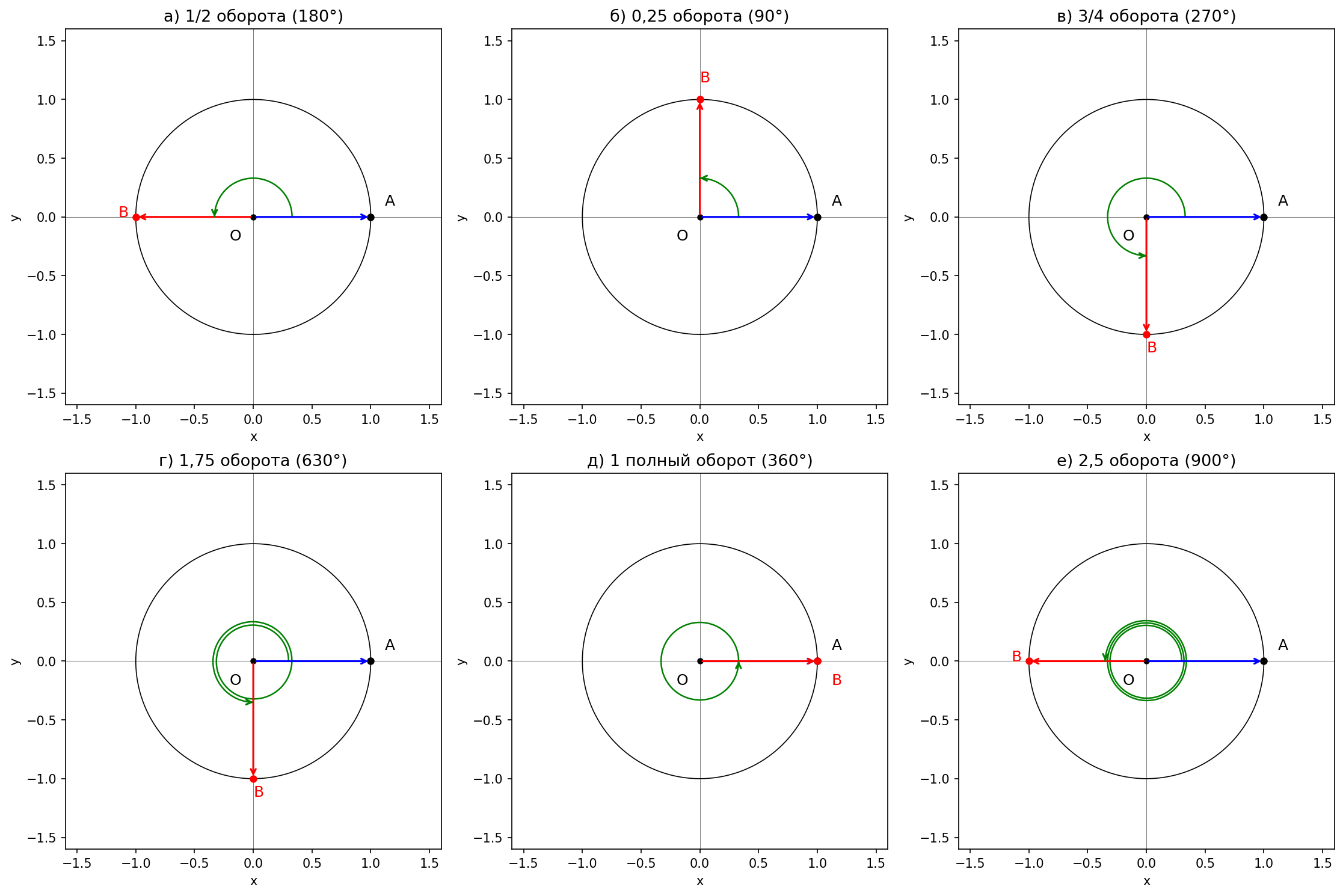 На каждом рисунке зелёная дуга со стрелкой показывает направление поворота (против часовой стрелки), синий вектор — , красный —