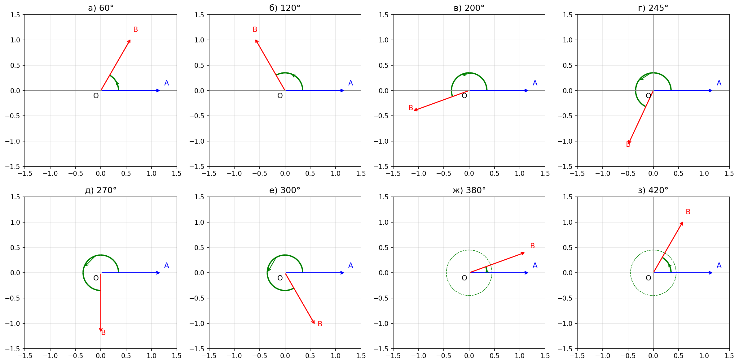 Во всех случаях начальный вектор направлен по положительному направлению оси