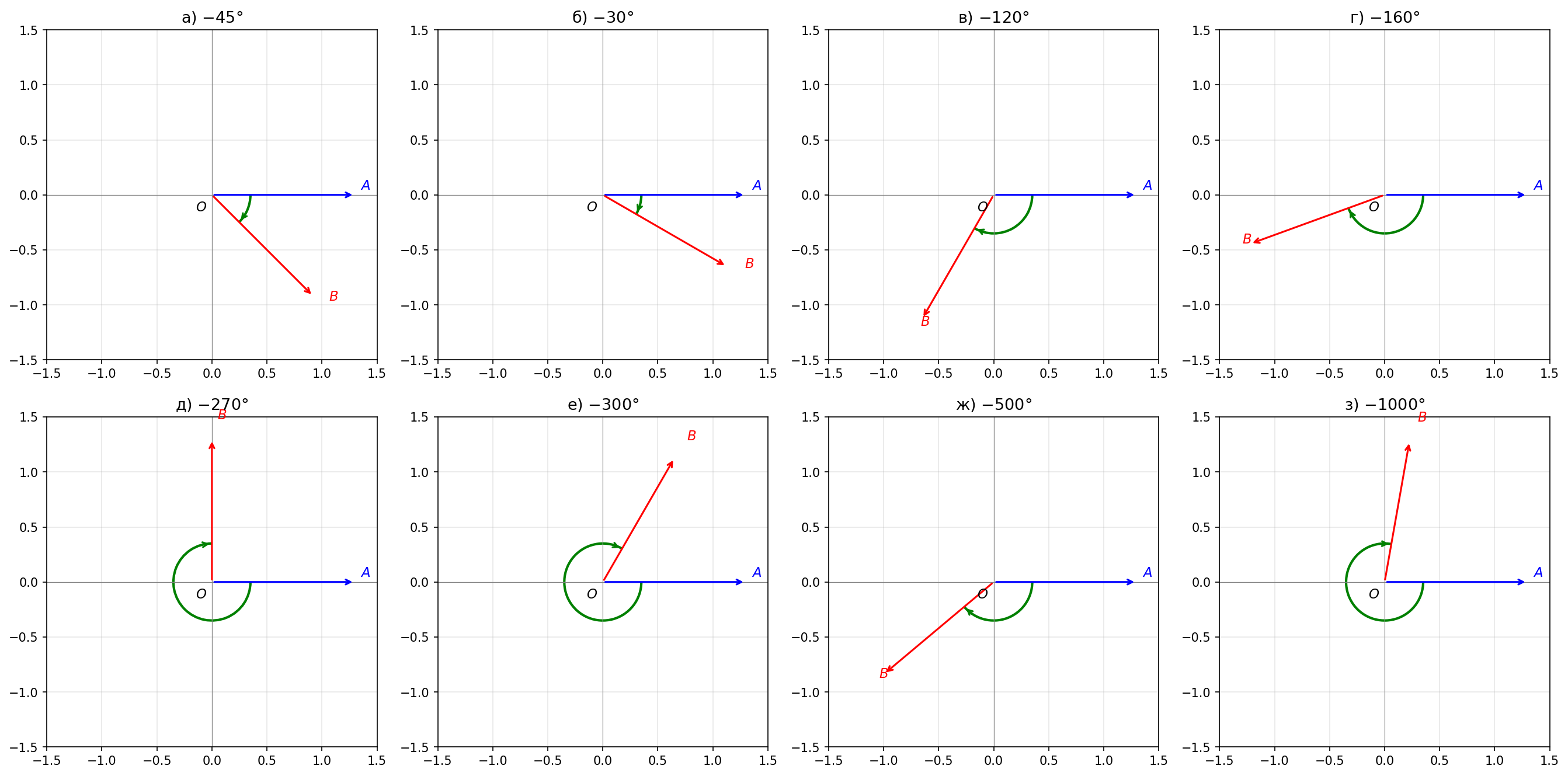 д) $-270°$; е) $-300°$; ж) $-500°$; з) $-1000°$.