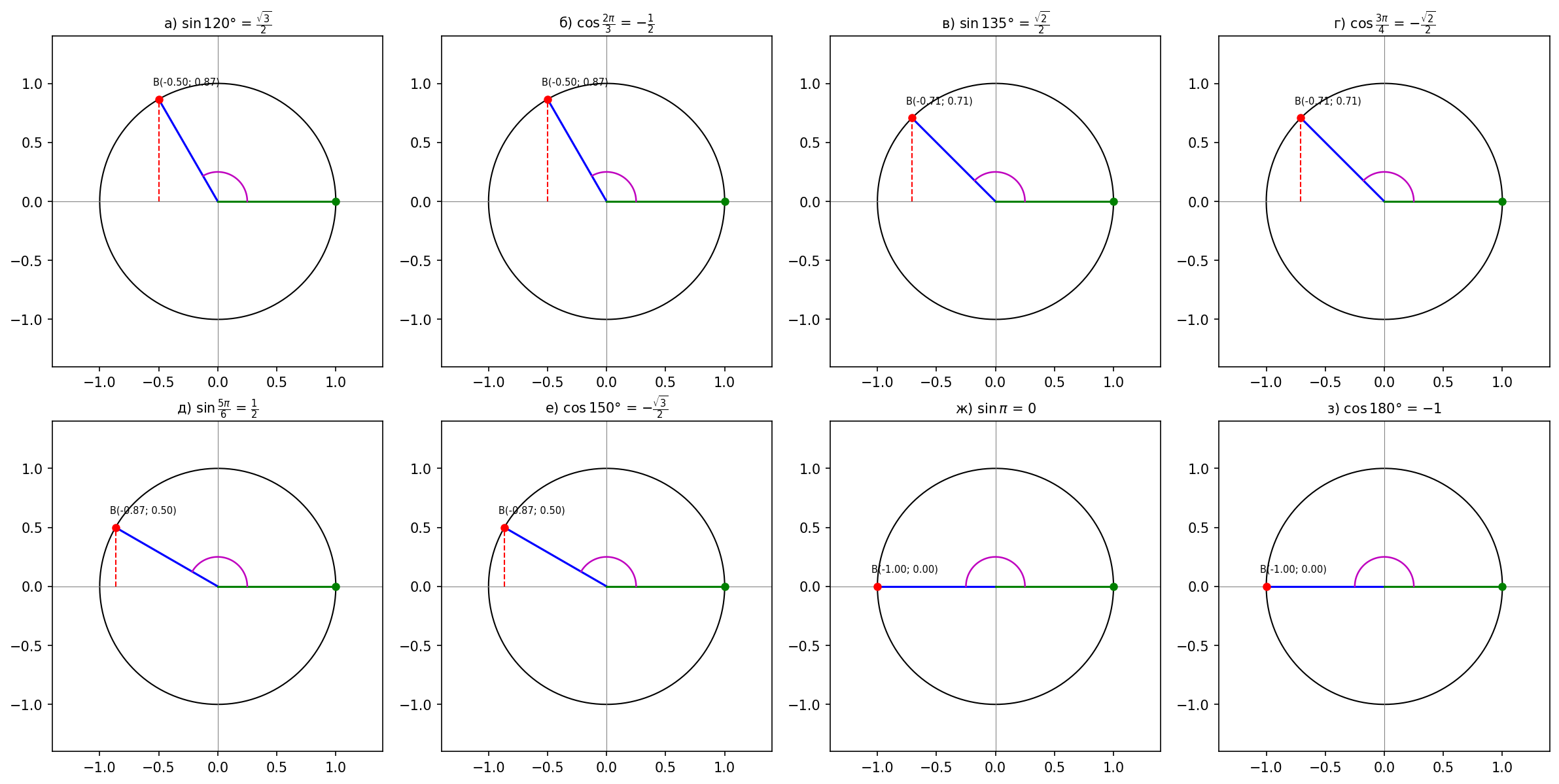 г) $\cos \dfrac{3\pi}{4}$;