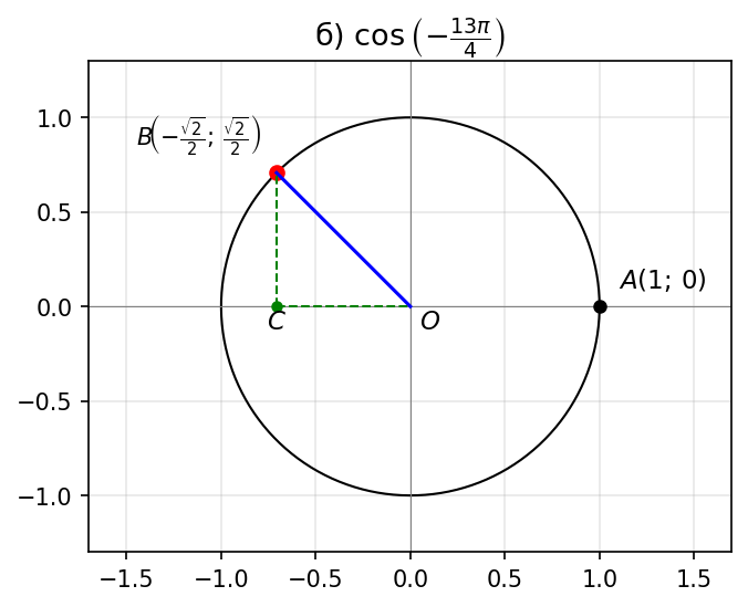 б) $\cos\left(-\dfrac{13\pi}{4}\right)$;