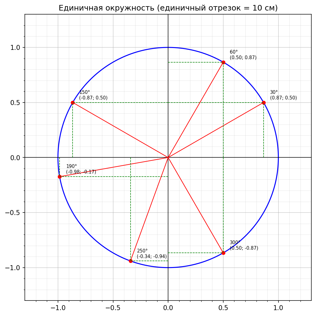 Построим единичную окружность на координатной плоскости и найдём приближённые значения синусов и косинусов, считывая координаты соответствующих точек.