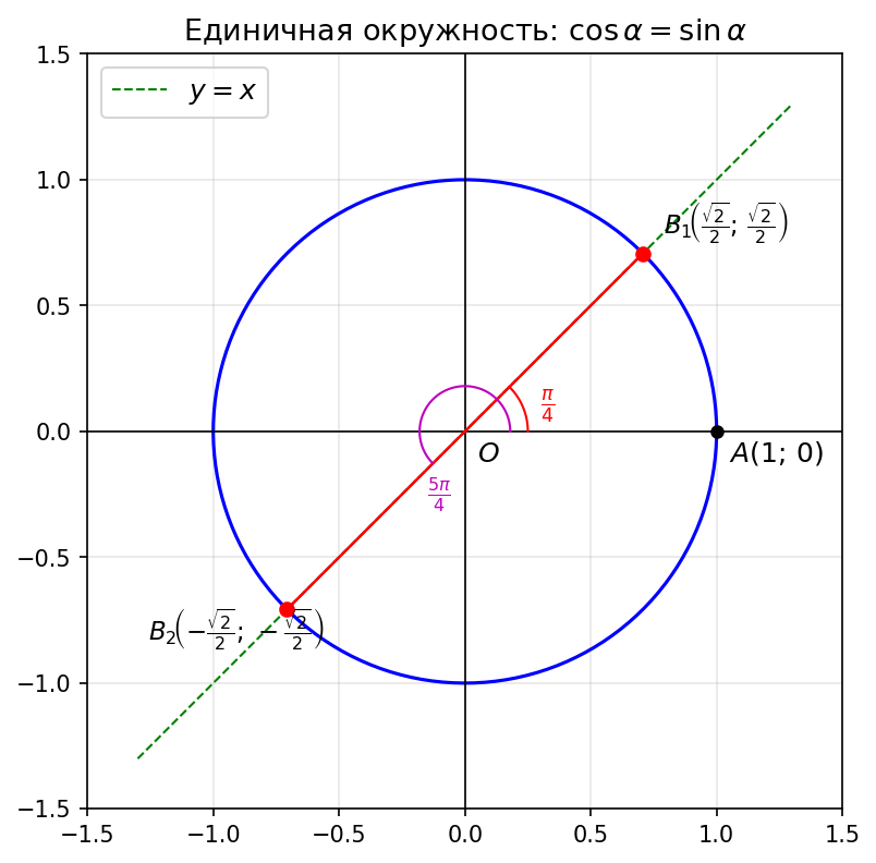 Условие: Выполняется ли равенство $\cos\alpha = \sin\alpha$ при каком-нибудь $\alpha$? Проиллюстрируйте своё решение на рисунке.
