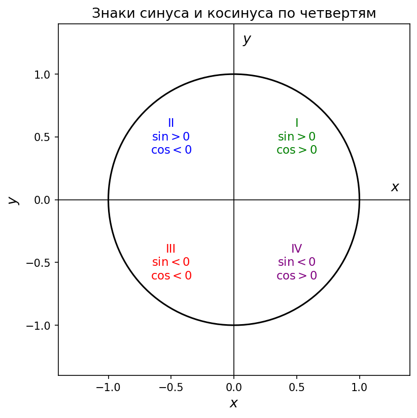 б) Какие знаки имеют синус и косинус угла $\alpha$, если точка единичной окружности, соответствующая углу $\alpha$, расположена в I четверти? во II четверти? в III четверти? в IV четверти?