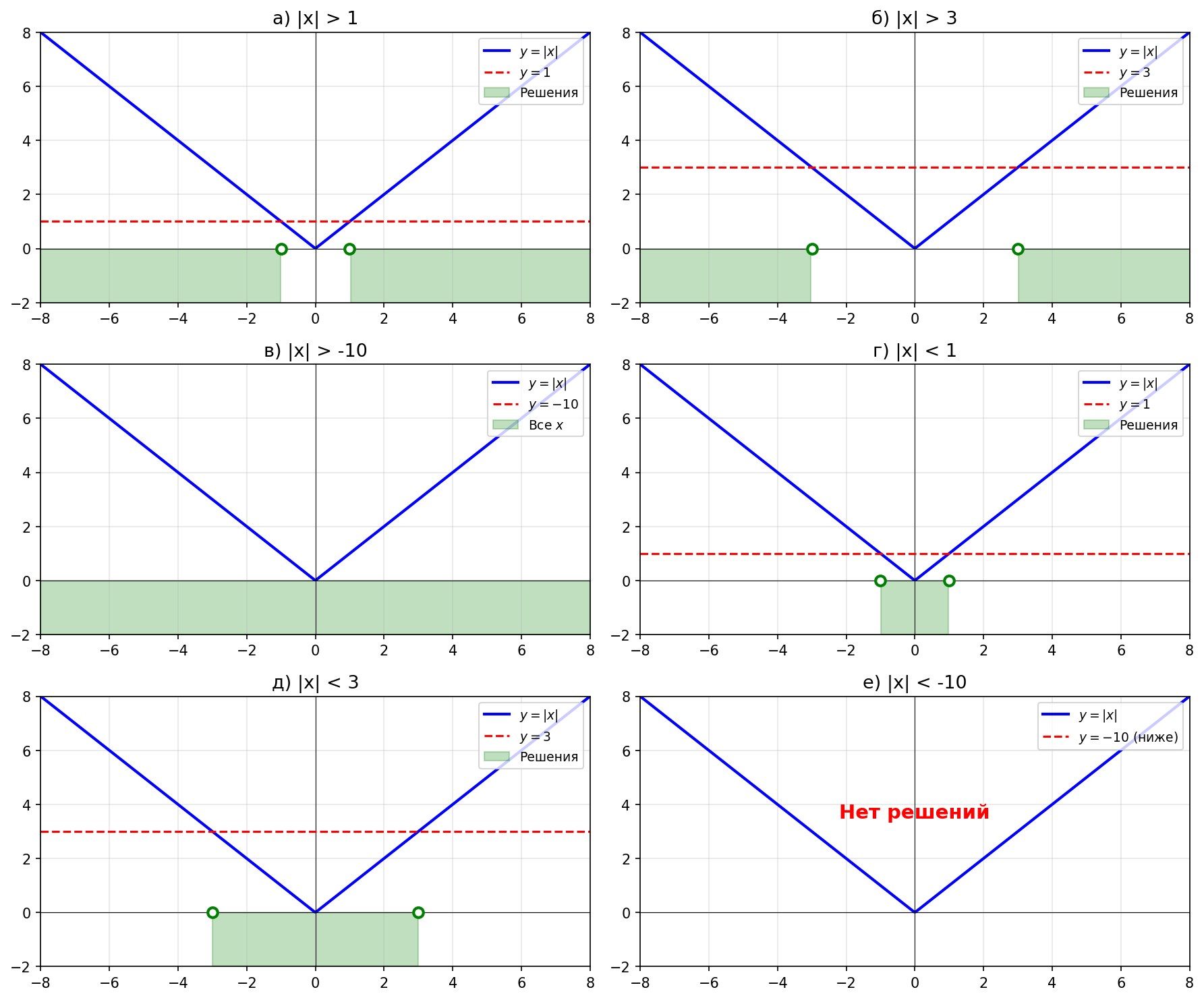г) $|x| < 1$; д) $|x| < 3$; е) $|x| < -10$.