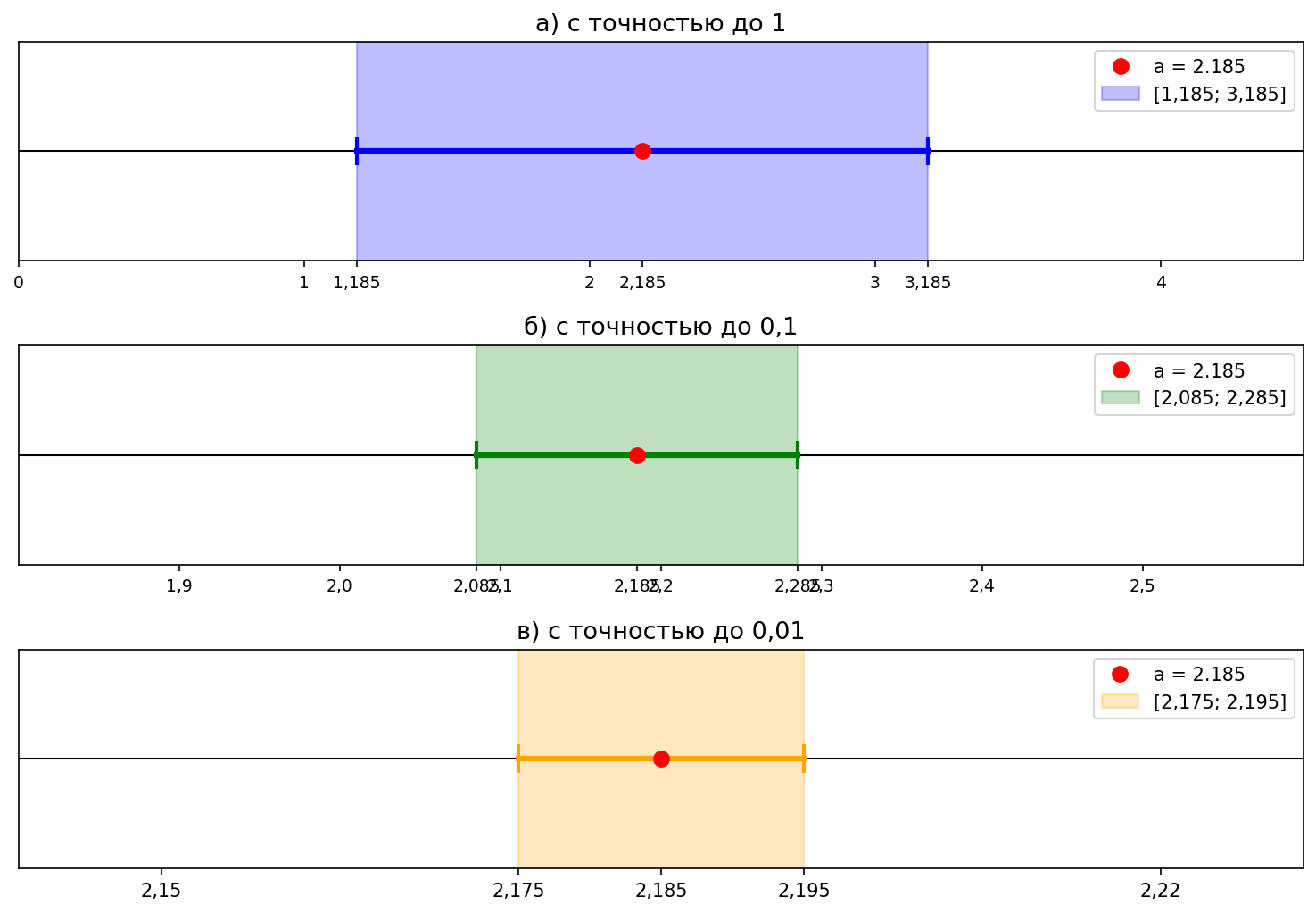 Нам нужно найти все целые, десятые и сотые числа, которые являются приближениями числа с заданной точностью, т.е. удовлетворяют условию