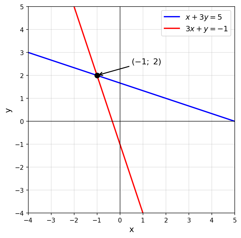 $$\begin{cases} x + 3y = 5, \\ 3x + y = -1. \end{cases}$$
