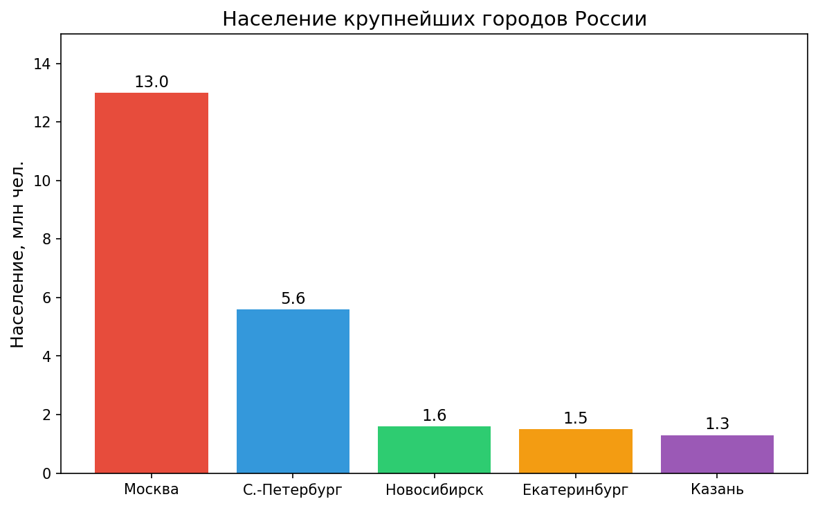 Население крупнейших городов России (млн чел.): Москва — 13,0; Санкт-Петербург — 5,6; Новосибирск — 1,6; Екатеринбург — 1,5; Казань — 1,3.