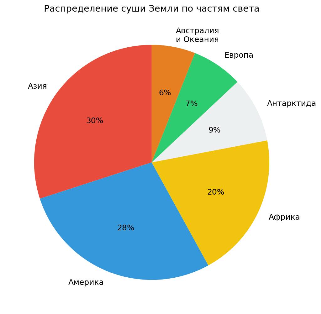 Распределение суши Земли по частям света: Азия — 30%, Америка — 28%, Африка — 20%, Антарктида — 9%, Европа — 7%, Австралия и Океания — 6%.