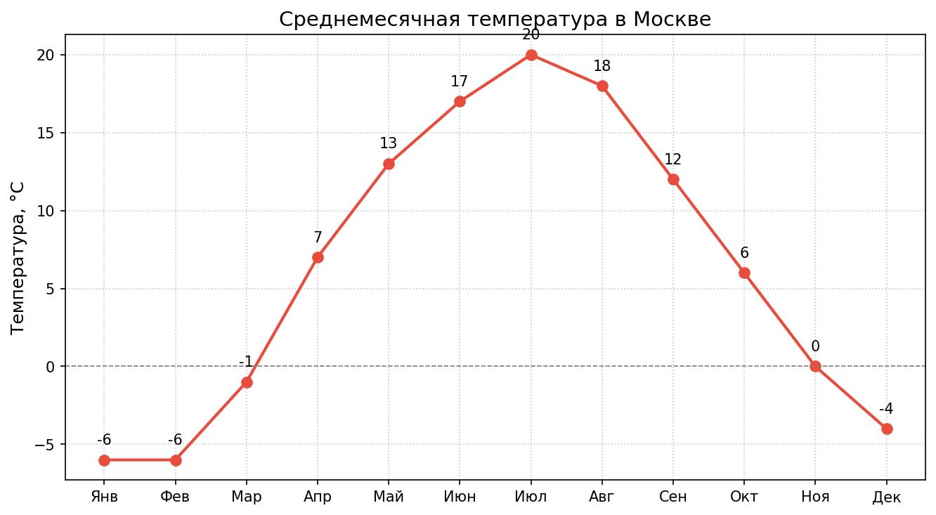 Средняя температура воздуха в Москве по месяцам (°C):