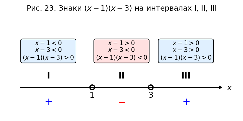 Условие: На рисунке 23 отмечены числа 1 и 3, обращающие произведение $(x - 1)(x - 3)$ в нуль. Определите, какие знаки имеет каждый множитель и их произведение на интервалах I, II, III.