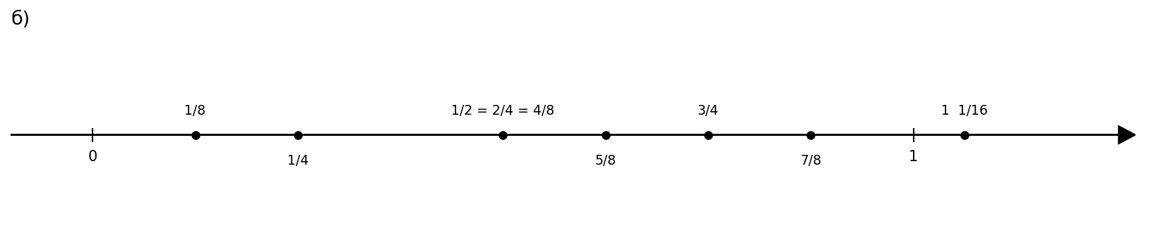 б) $\dfrac{1}{2}$; $\dfrac{1}{4}$; $\dfrac{3}{4}$; $\dfrac{2}{4}$; $\dfrac{1}{8}$; $\dfrac{5}{8}$; $\dfrac{7}{8}$; $\dfrac{4}{8}$; $1\dfrac{1}{16}$.