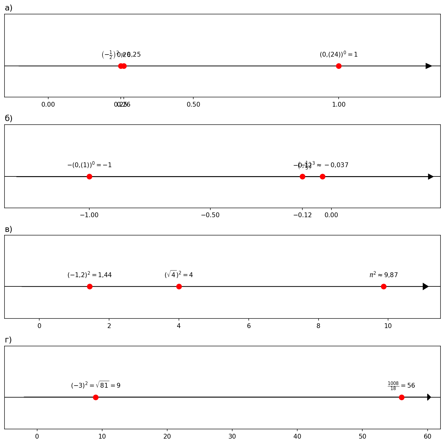 в) $(\sqrt{4})^{2}$; $\pi^{2}$; $(-1{,}2)^{2}$; г) $(-3)^{2}$; $\sqrt{81}$; $\dfrac{1008}{18}$.